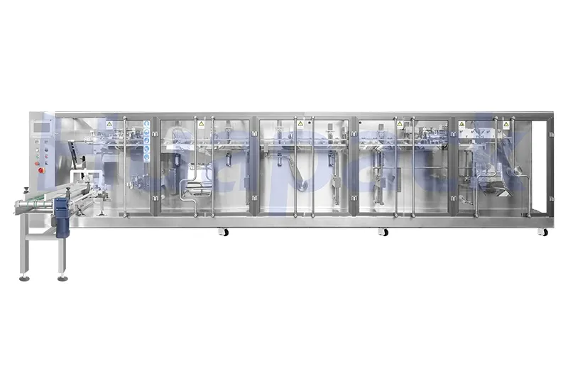 Эти горизонтальные машины для фасовки в готовые пауч-пакеты работают со стабильной скоростью около 40 пакетов в минуту и рассчитаны на крупные объёмы наполнения до 4000 мл. Оборудование имеет усиленную конструкцию и оснащено высокопроизводительными сервоприводами, что позволяет использовать его в непрерывном и интенсивном производстве. Увеличенный бункер и расширенный диапазон наполнения уменьшают необходимость частой дозагрузки продукта, обеспечивая более стабильную работу линии. Машина оснащена системой вакуумирования и продувки азотом, что позволяет эффективно удалять воздух из пакетов большого объёма, а усиленный узел термической запайки формирует прочные и надёжные швы.