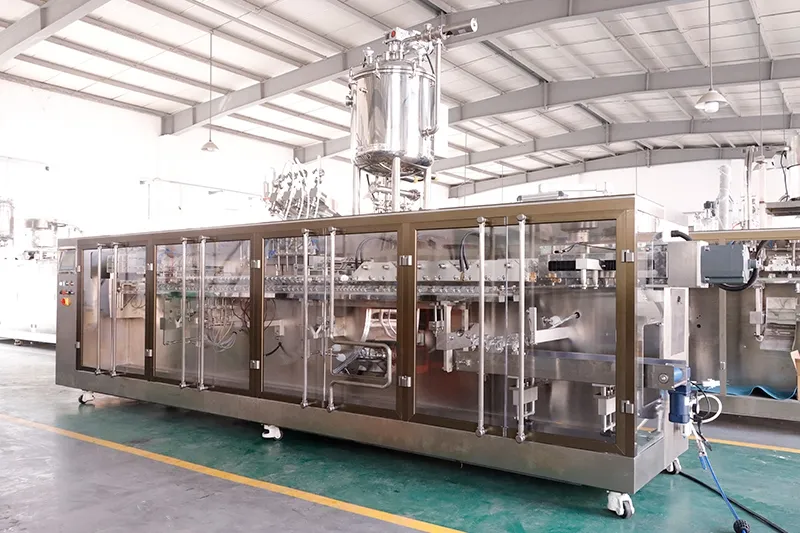 Эта машина предназначена для высокоскоростной упаковки в заранее изготовленные фигурные стоячие пауч-пакеты с параллельной обработкой нескольких пакетов одновременно. В качестве исходной упаковки используются готовые пакеты, а четырёхрядный узел механических захватов за один цикл одновременно подаёт, раскрывает и позиционирует сразу четыре пакета. Далее каждый пакет параллельно проходит этапы дозирования, наполнения и запайки. Такая синхронизированная конструкция позволяет перевести упаковку в фигурные пакеты, которая обычно работает на более низкой скорости, в стабильный и масштабируемый производственный процесс. В результате достигается высокая производительность без потери точности и без ухудшения внешнего вида пакета.