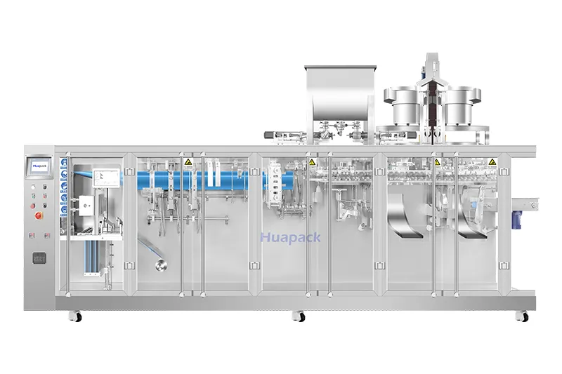Горизонтальная фасовочно-упаковочная машина для пауч-пакетов со штуцером с двумя дозирующими головками