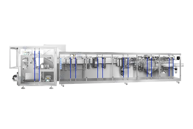 Горизонтальная фасовочно-упаковочная машина для пакетов дой-пак со штуцером с двумя дозирующими головками